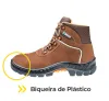 A biqueira de plástico é leve, confortável e protege contra impactos leves, ideal para ambientes de baixo risco.