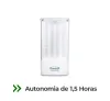 Possui fluxo luminoso de 300 lúmens, cobrindo áreas de até 50 m² com autonomia de 1,5 horas, atendendo com eficiência às exigências de aclaramento em ambientes internos. A alimentação é bivolt automática (110/220V) e a bateria de níquel-cádmio (Ni-Cd) garante até 500 ciclos de carga.