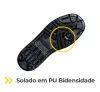 - Solado em PU Bidensidade: Injetado diretamente ao cabedal, antiderrapante, resistente a óleo combustível e projetado para estabilidade e aderência em diversos tipos de piso.