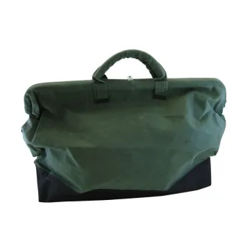 Bolsa para guardar e transportar ferramentas e equipamentos de proteção individual, em lona impermeável, fundo reforçado com cravos na base para melhor apoio ao chão, armação em aço galvanizado, alça em sola e porta cadeado.