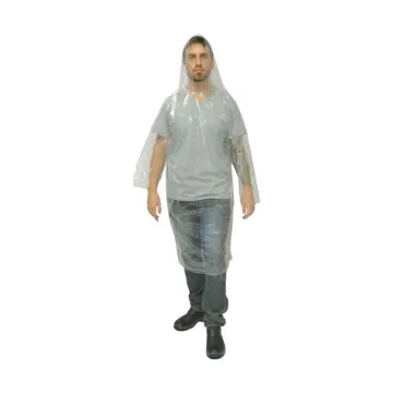 Capa de chuva descartável transparente. Possui 0,5mm de espessura, com manga longa e capuz.