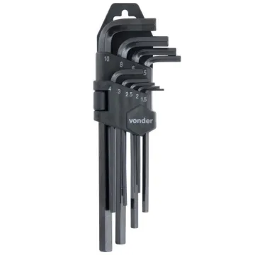 1 Jogo de chaves allen, composto por um suporte plástico com 9 peças, sendo: 1,5mm, 2mm, 2,5mm, 3mm, 4mm, 5mm, 6mm, 8mm e 10mm.